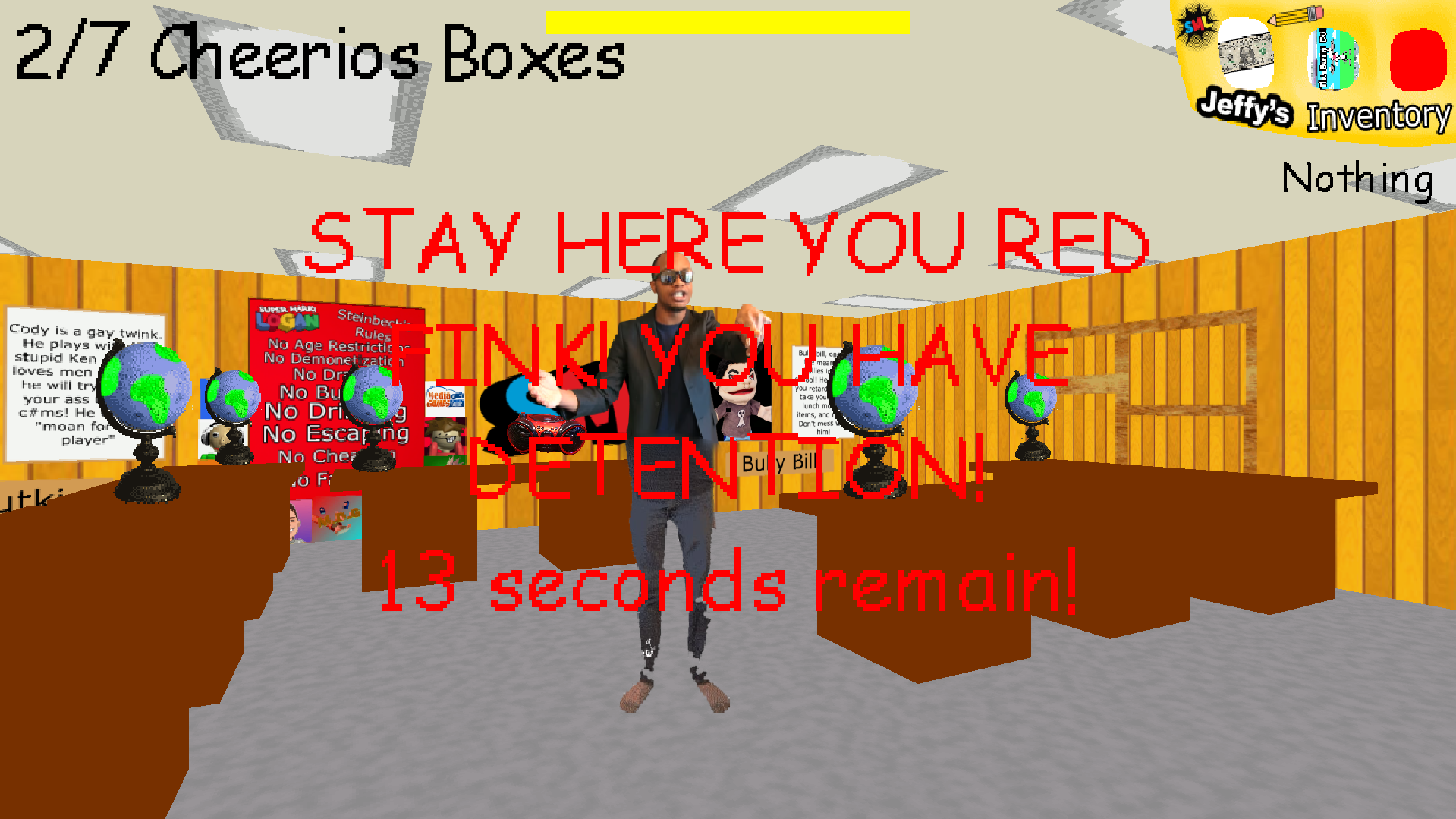 To escape, he must collect 7 boxes of Cheerios scattered around the school, for absolutely no reason at all. But it won’t be easy…